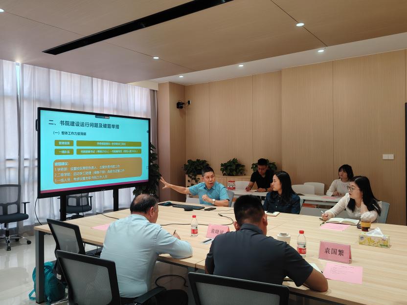 副校长孙虎汇报了书院工作机制现状,指出当前在人员配置、资源下沉、运维动力和信息化建设等方面仍存在不足,并提出相应改进措施。常务副校长袁国繁和校长助理袁晓斌分别就协同机制与资源整合提出建议。