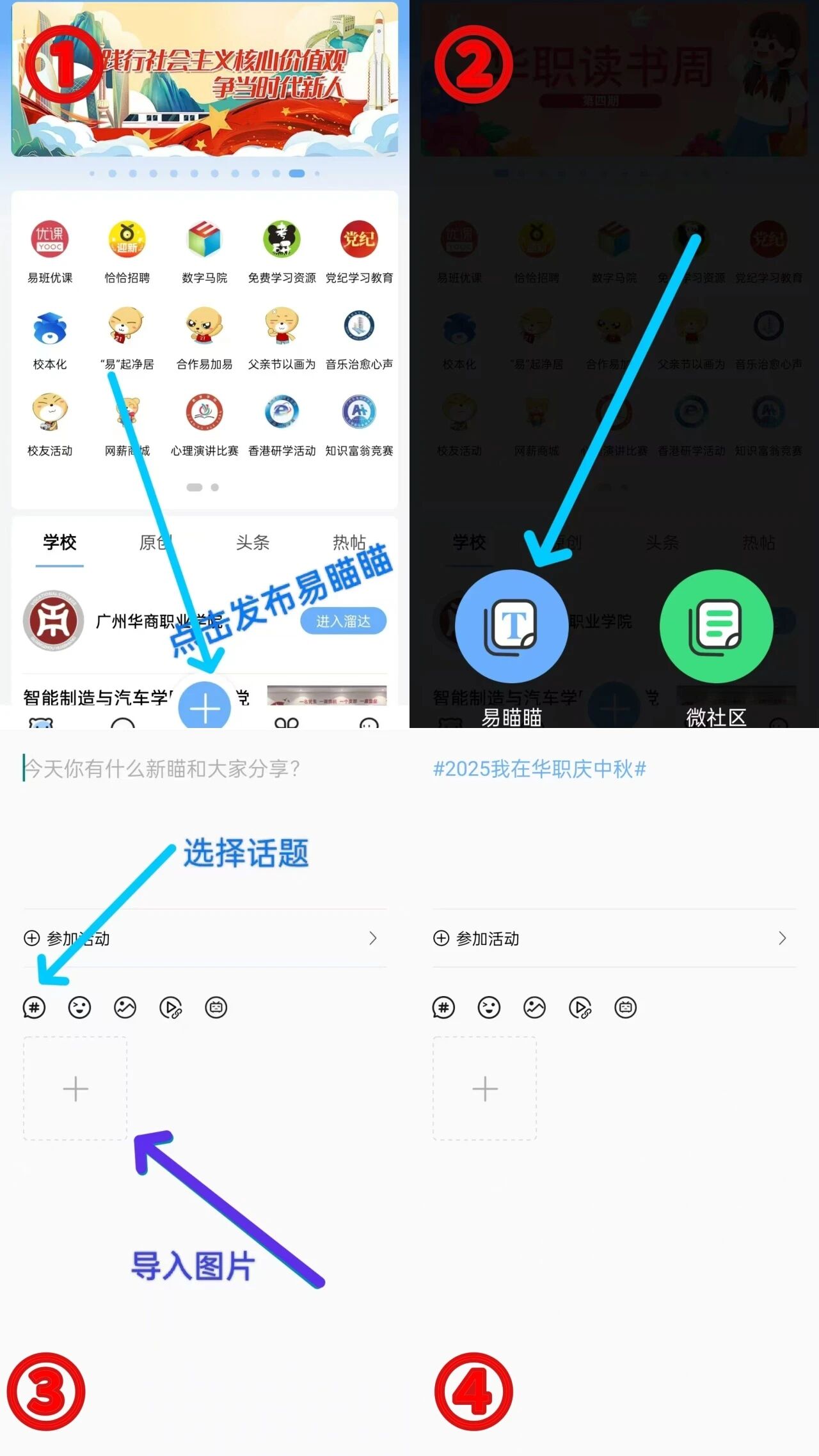 2025年9月28日18:00-9月29日24:00期间,通过易班平台易喵喵端口,输入互动口令#2025我在华职庆中秋#,跟帖发布现场参与中秋游园会的感悟和照片,参与话题互动,将随机抽取幸运儿赠送易班文创产品。易喵喵打卡成功后,截图上传至推文中的接龙中。