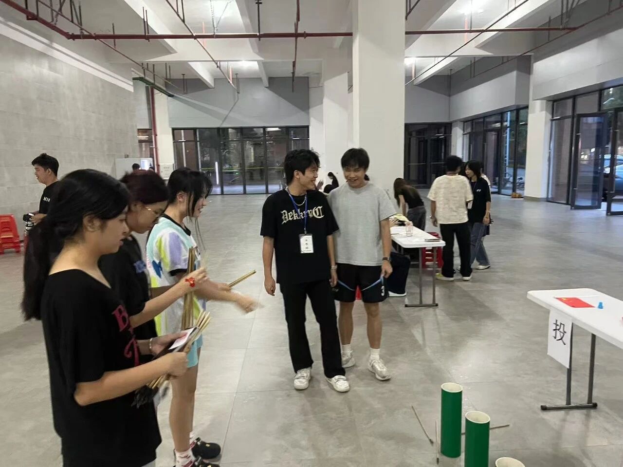 执箭投壶活动超有意思!同学们领5支箭,站在规定线后瞄准投壶。有人屏息凝神,箭支稳稳入壶;有人调整姿势,越投越顺。当投中3支箭完成任务时,大家都兴奋欢呼,现场满是专注与雀跃,传统游戏超有魅力!