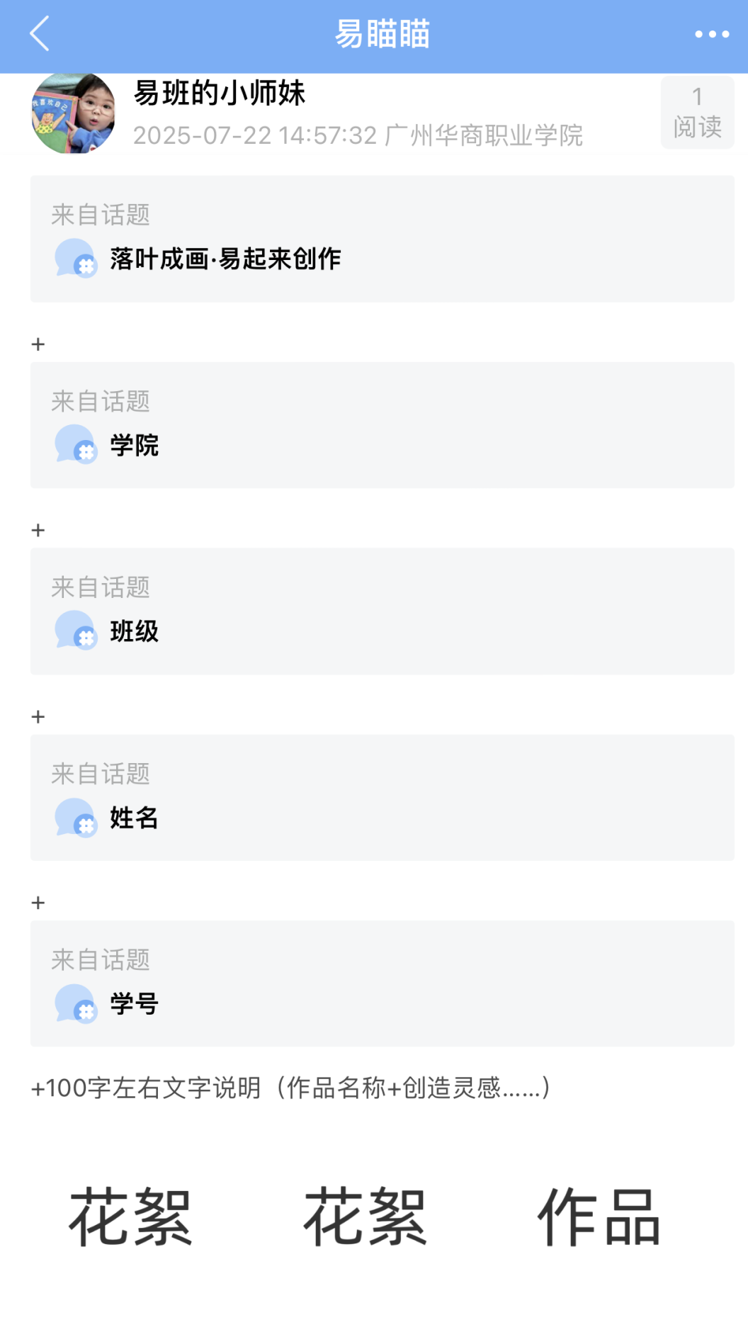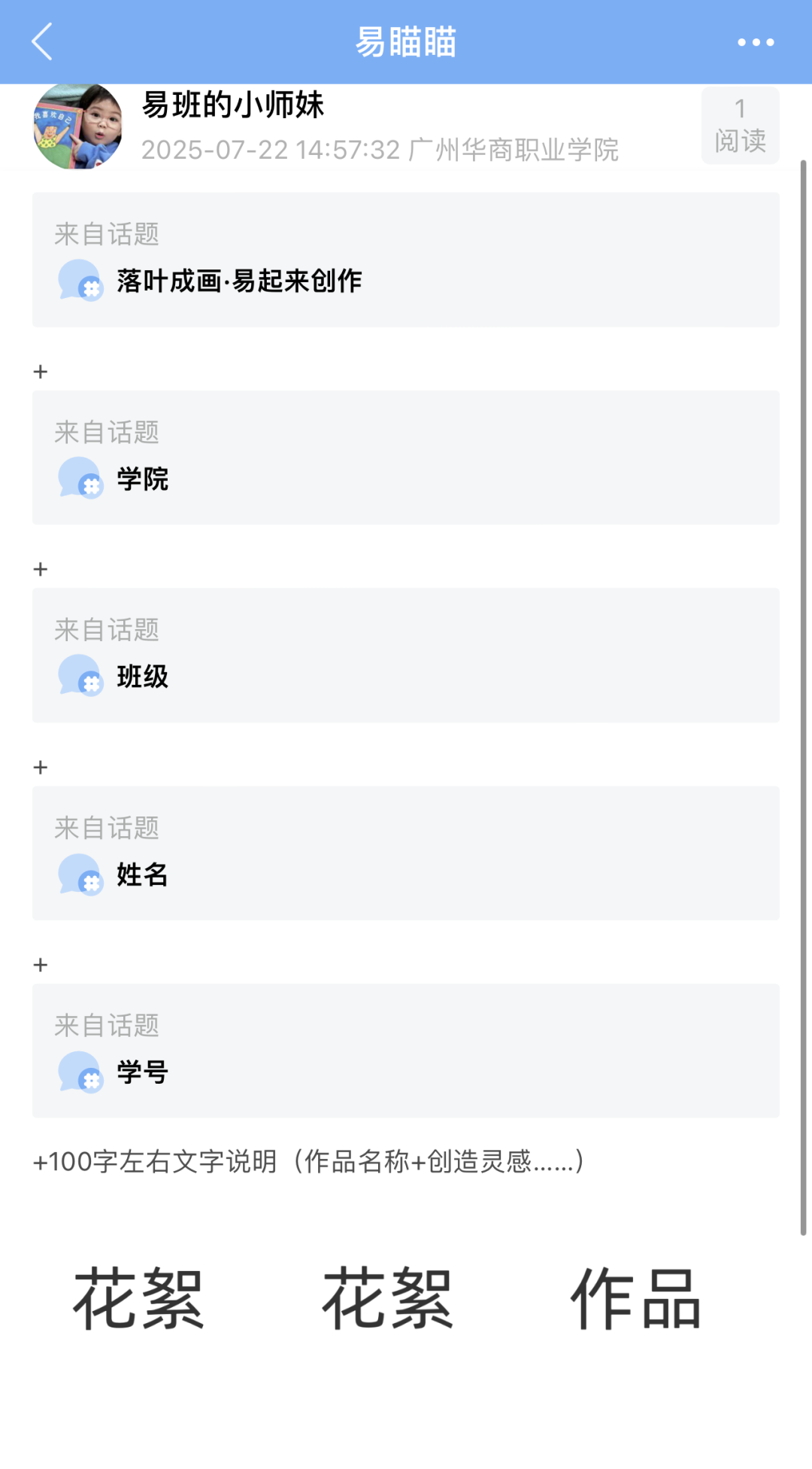 同学们需要自行在校园内收集落叶(主材料),可搭配一些小花小草进行创意贴画制作,作完成后需上传到易班App。