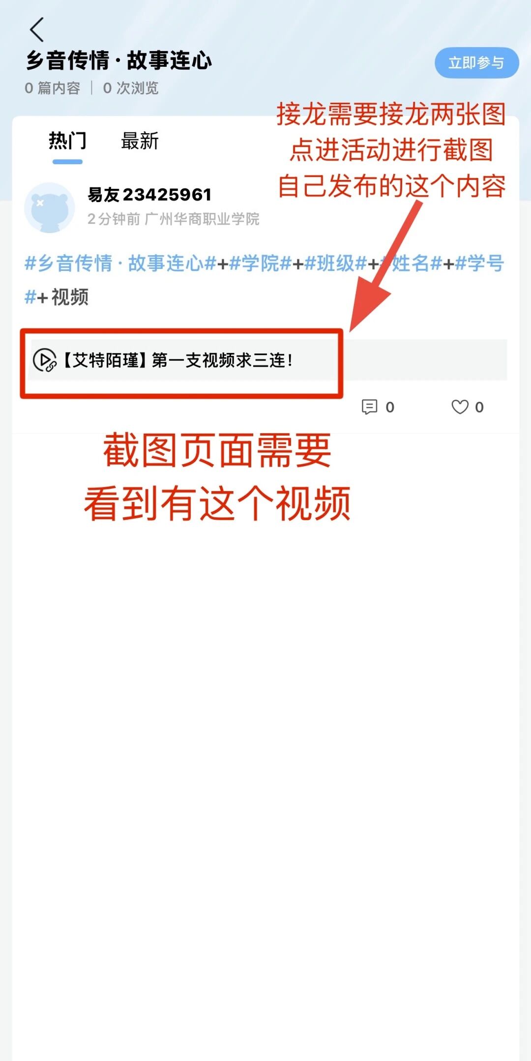 1、作品需要在易班APP-“易瞄瞄”发布并进行接龙。(接龙需要上传易瞄瞄发布截图及作品视频)