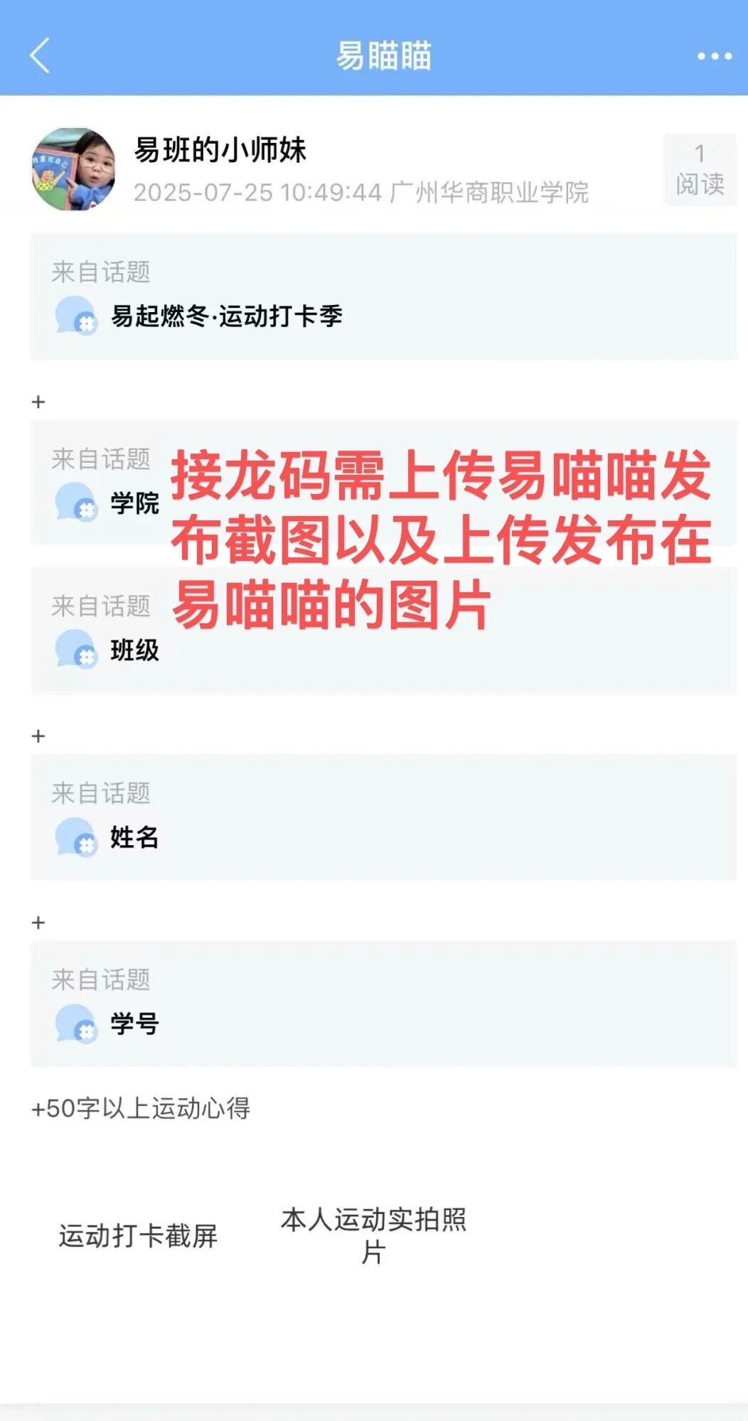 使用运动App(keep,悦跑圈…)记录运动数据(需显示日期、时长、里程等)截屏+运动的实景照片需要本人出境可不露脸+50字左右运动心得,上传至易班App并接龙。