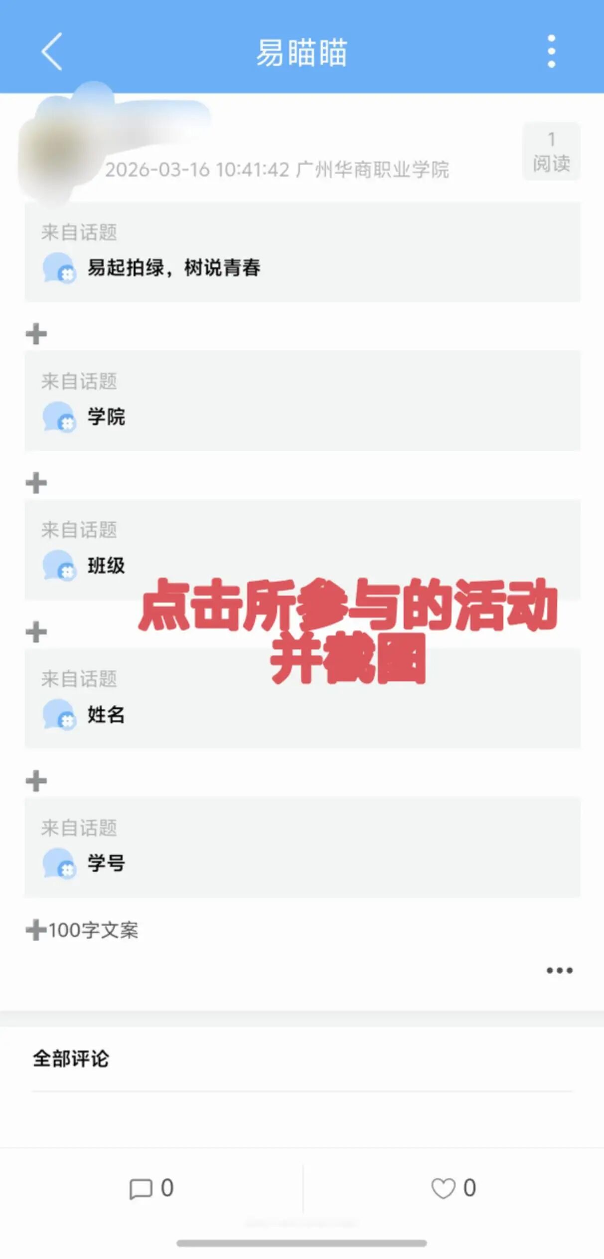 #易起拍绿,树说青春#+#学院#+#班级#+#姓名#+#学号#+30字左右文案