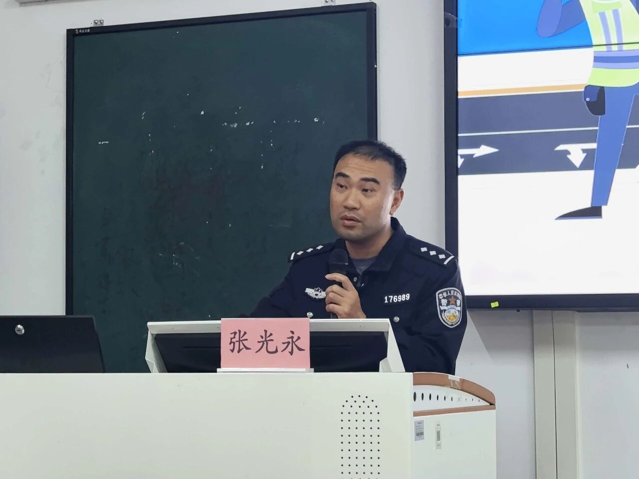 紧接着,新会公安分局交管大队崖门中队副中队长张光永,为同学们开展交通安全专题宣讲。作为长期扎根崖门辖区交通秩序管理、事故处理及安全宣教一线的工作人员。宣讲中,他结合校园周边复杂交通环境,针对学生步行、骑行自行车、电动车、乘坐私家车、搭乘顺风车等日常高频出行方式,逐一拆解安全出行规范与注意事项;重点普及安全头盔与安全带正确佩戴标准,深刻剖析横穿马路、路边追逐打闹等危险行为的安全隐患;同时,结合崖门辖区内发生的真实交通事故案例,详细解读违规出行引发的严重后果,以案为鉴、以警促学,警示全体学生摒弃交通陋习,自觉遵守交通法规,牢记“一盔一带、安全常在”的理念,做到平安出行、文明出行。