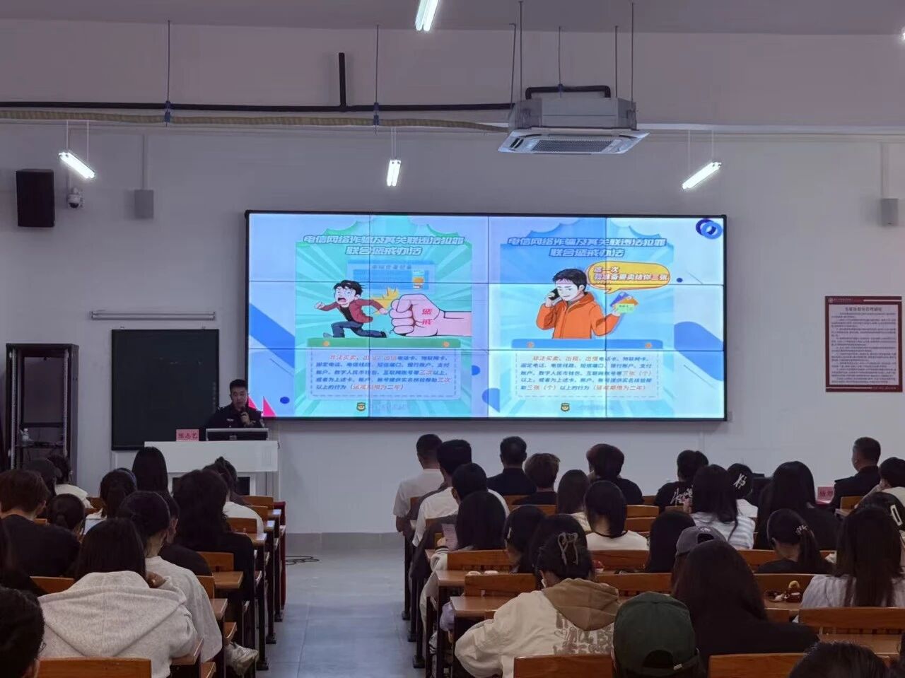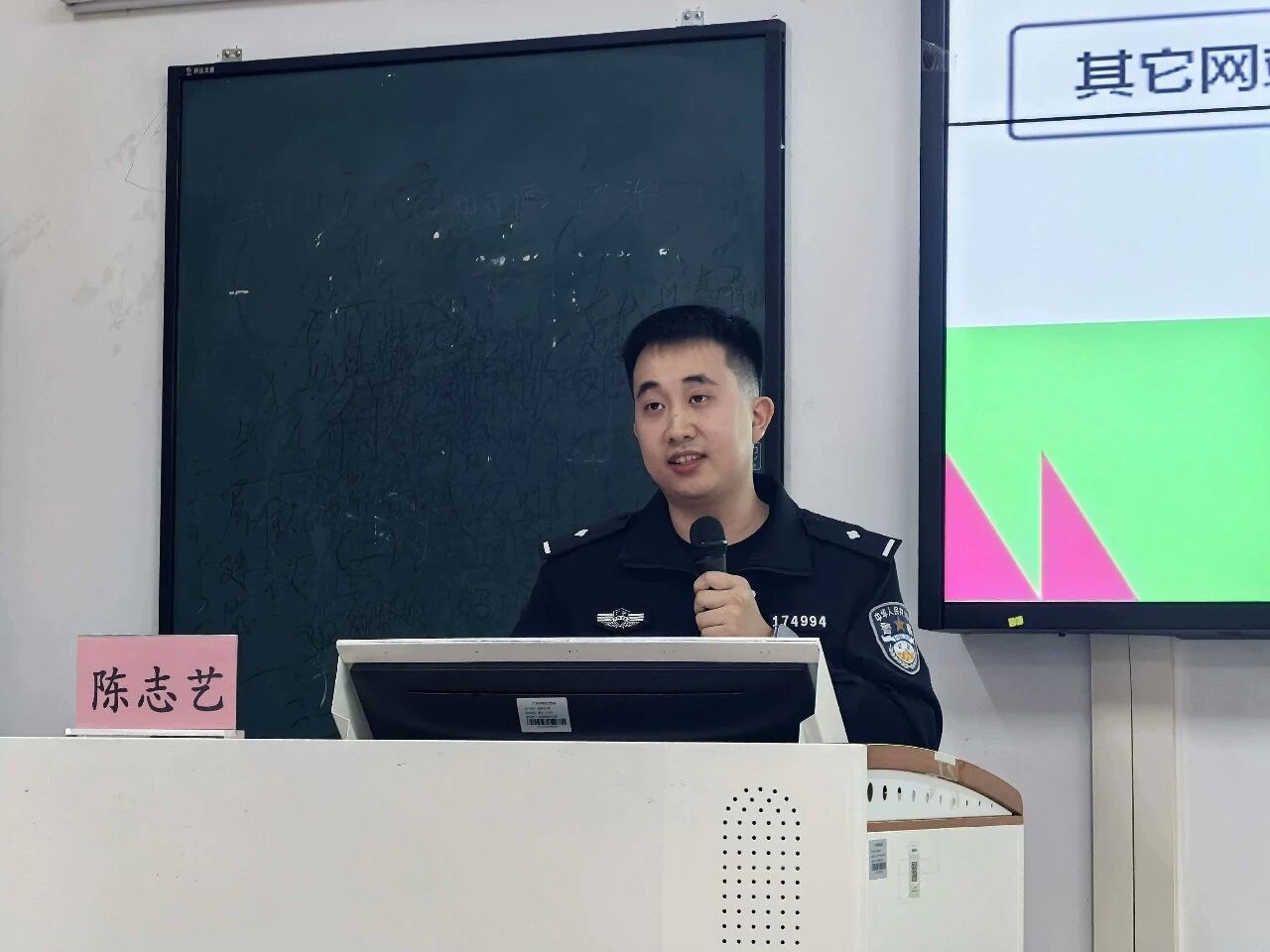 首先,由长期深耕电信网络诈骗案件研判与侦办一线的崖门派出所民警陈志艺,为同学们开展校园防诈安全知识宣讲。凭借丰富的办案经验,陈警官精准把握学生群体易受骗的心理特征——诸如贪小利、惧权威、急于证明自己的心理弱点,以及刷单返利、游戏交易、冒充公检法等高频诈骗套路,直击校园反诈痛点。他擅长以案析法、以技防骗,结合高校学生高发被骗案例,细致拆解每类骗局的作案逻辑与话术漏洞,用通俗易懂的语言为同学们传授“不轻信、不转账、不泄露”的实用防范技巧,助力大家筑牢识诈、防诈、反诈的思想防线,守护好自身的“钱袋子”。