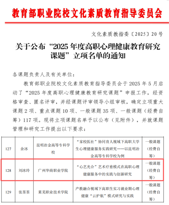 近日,包装技术与设计学院刘冰玲老师主持的课题《“心艺光合”艺术疗愈模式在高职心理健康服务中的实践与创新研究》,成功获批教育部职业院校文化素质教育指导委员会2025年度高职心理健康教育研究课题立项(课题编号:XL2025128)。标志着我校二级心理辅导站建设在特色化、专业化的探索上取得重要突破。