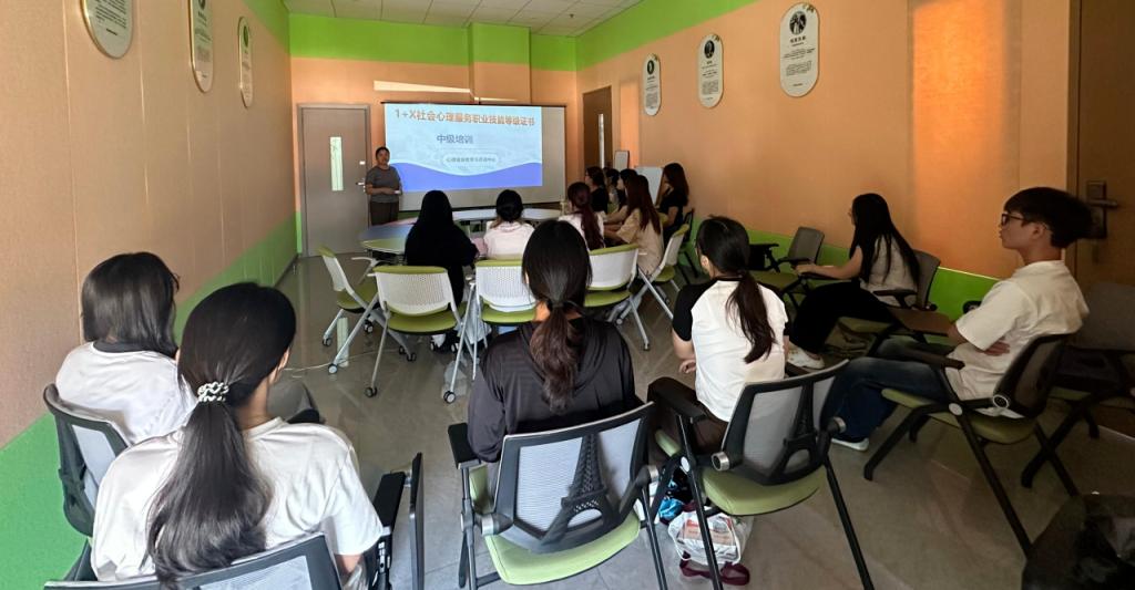 学务部心理中心严格遵循 “1+X” 证书制度考核标准,深入研讨岗位核心能力需求,结合社会心理服务实战场景梳理授课重难点。针对考生群体特点,量身定制了培训计划,利用课后、午休等碎片化时间开展专题强化、随机抽查与考前冲刺训练。考前组织多场模拟测试,实训中心全力配合,朋辈志愿者化身教学助手协助答疑,考生们通过钉钉群每日打卡反馈学习进度,形成 “教 - 学 - 练 - 测” 的完整闭环。“理论 + 实操” 的培训模式让考生们在短时间内实现了专业技能的快速提升。